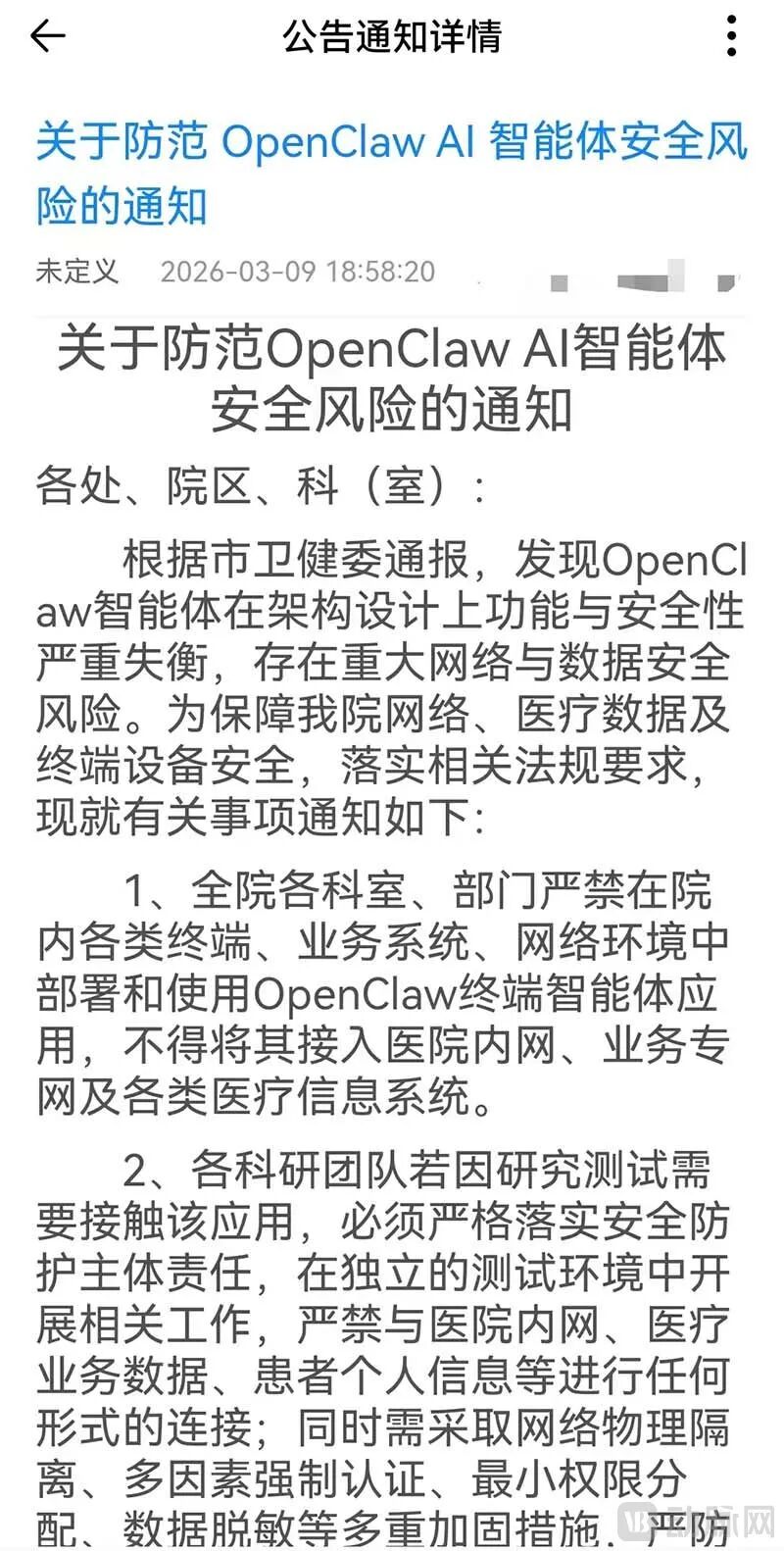 某知名三甲医院已发布关于OpenClaw的风险通知