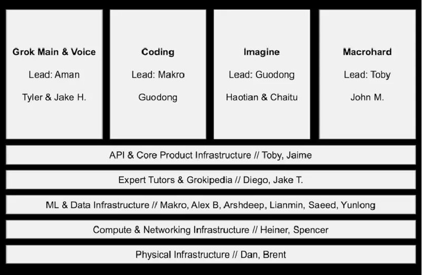 在2月12日公司全员会议上,这个传闻得到佐证。马斯克宣布为了改善执行业务的速度,xAI组织架构进行大调整,公司现在分为四大职能部门: