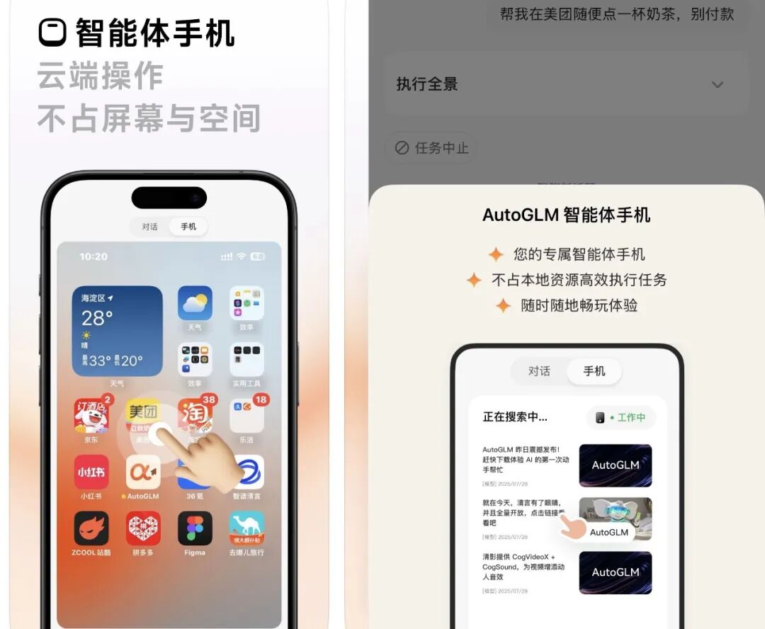 2025年8月,智谱在AutoGLM中正式推出智能体手机,宣称“全球首个手机通用Agent”,主打“云端操作,不占屏幕空间”——为用户在云端数据中心配备一台虚拟手机和一台虚拟电脑,拥有完整的操作系统与应用生态,支持在多个App间协同操作。覆盖小红书、淘宝、美团等40余款高频应用,且完全免费,一度被戏称为“国产版Manus”。