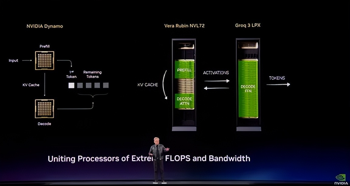 2. 解码的注意力环节:主要是计算当前产生的token与历史tokens(KV Cache,对话存储的记忆)的关系,是计算和存储并重的工作性质,也是在Vera Rubin上完成,频繁读取Rubin上的HBM内存单元。