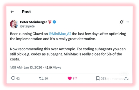OpenClaw的创始人Peter Steinberger在Twitter上推荐MiniMax代替Anthropic用于编程子代理,理由是“性能接近但成本只有5%”。