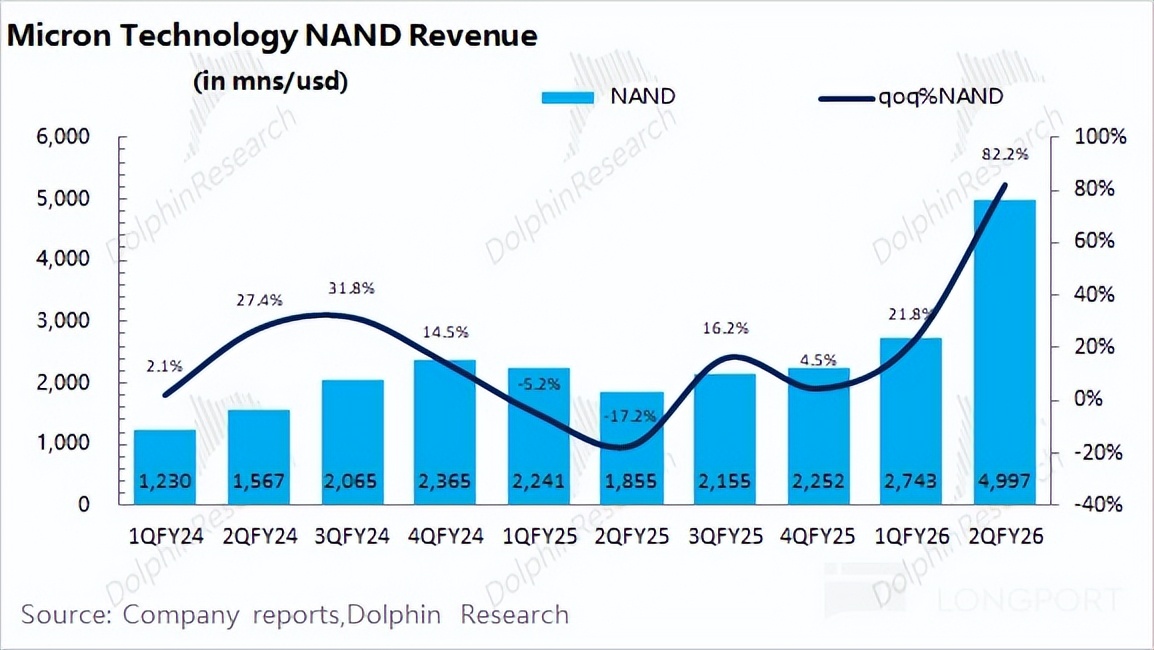 美光公司 2026 财年第二季度总营收为 238.6 亿美元,环比增长 75%,好于市场预期(199 亿美元)。本季度的收入环增,来自于 DRAM 和 NAND 的双双推动。