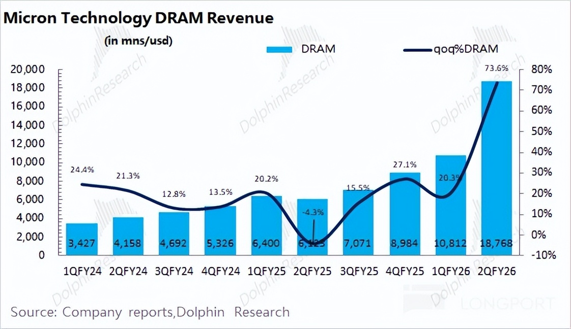 具体来看:①传统 DRAM 贡献了最大的增量,预计本季度实现收入约 160 亿美元,环比增长 80% 以上,AI 需求开始带动 DDR 产品的需求回升;②海豚君预估 HBM 本季度实现收入约 27 亿美元左右,环增 5 亿美元左右,主要受益于 HBM3E、HBM4 的量产出货;