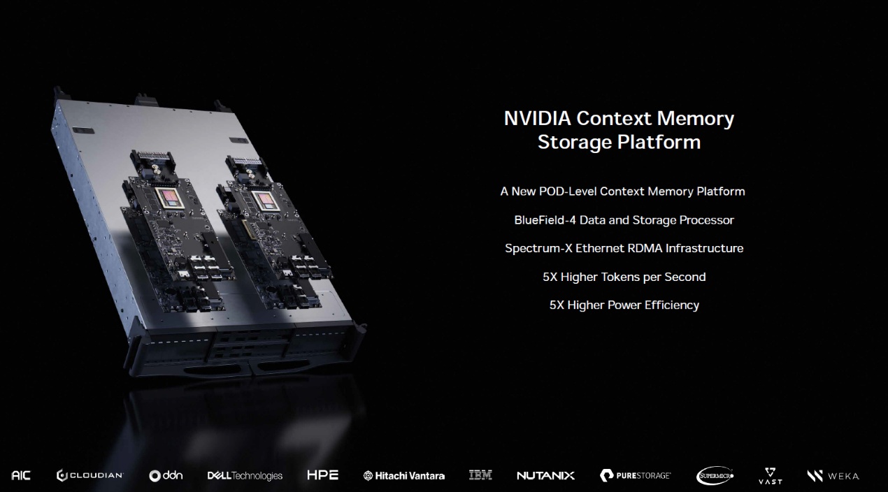 英伟达在 Rubin 结构中新增 “推理上下文存储平台”(ICMS 平台):新增的 ICMS 专用上下文存储,将 KV Cache 从 HBM 下沉至更具性价比的存储介质,释放 HBM 带宽用于计算,从而实现推理阶段的降本。