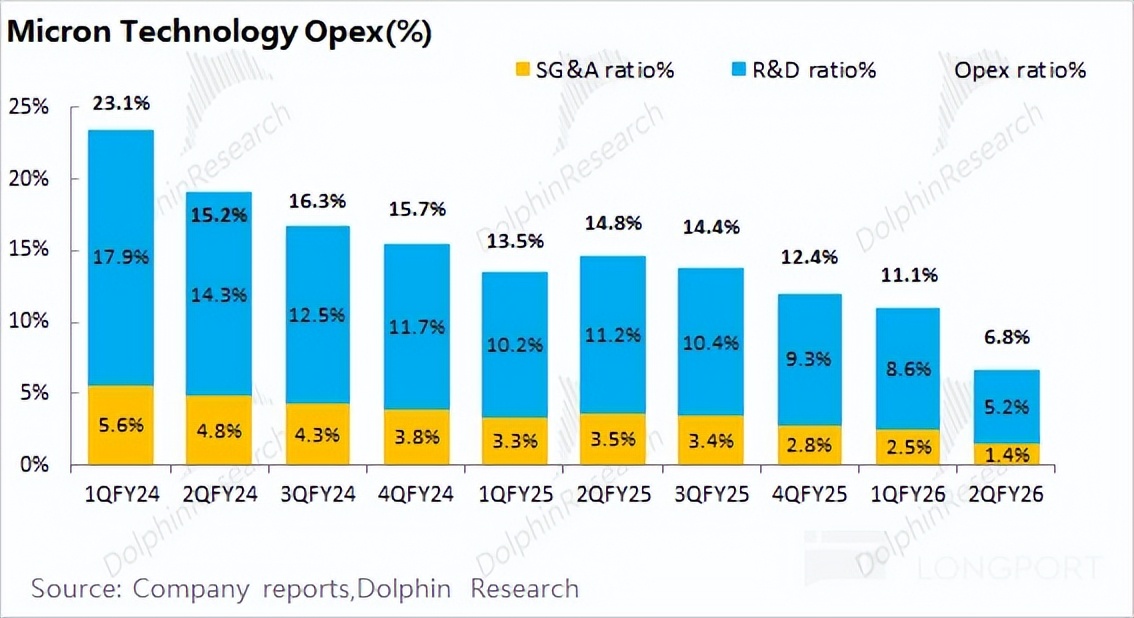 美光公司 2026 财年第二季度经营费用 16.2 亿美元,环比增长 7.3%。由于收入端增速更快,公司本季度经营费用率下降至 6.8%。