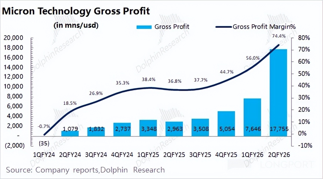 美光公司 2026 财年第二季度实现毛利 178 亿美元,其中公司本季度毛利率为 74.4%,环比提升 18.4pct。毛利率的提升,主要是由传统存储产品价格上涨的带动。
