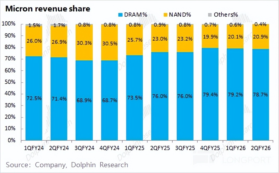 从最新的财报看, DRAM 和 NAND 仍然是公司最重要的收入来源,其中 DRAM 的收入占比维持在 8 成左右。