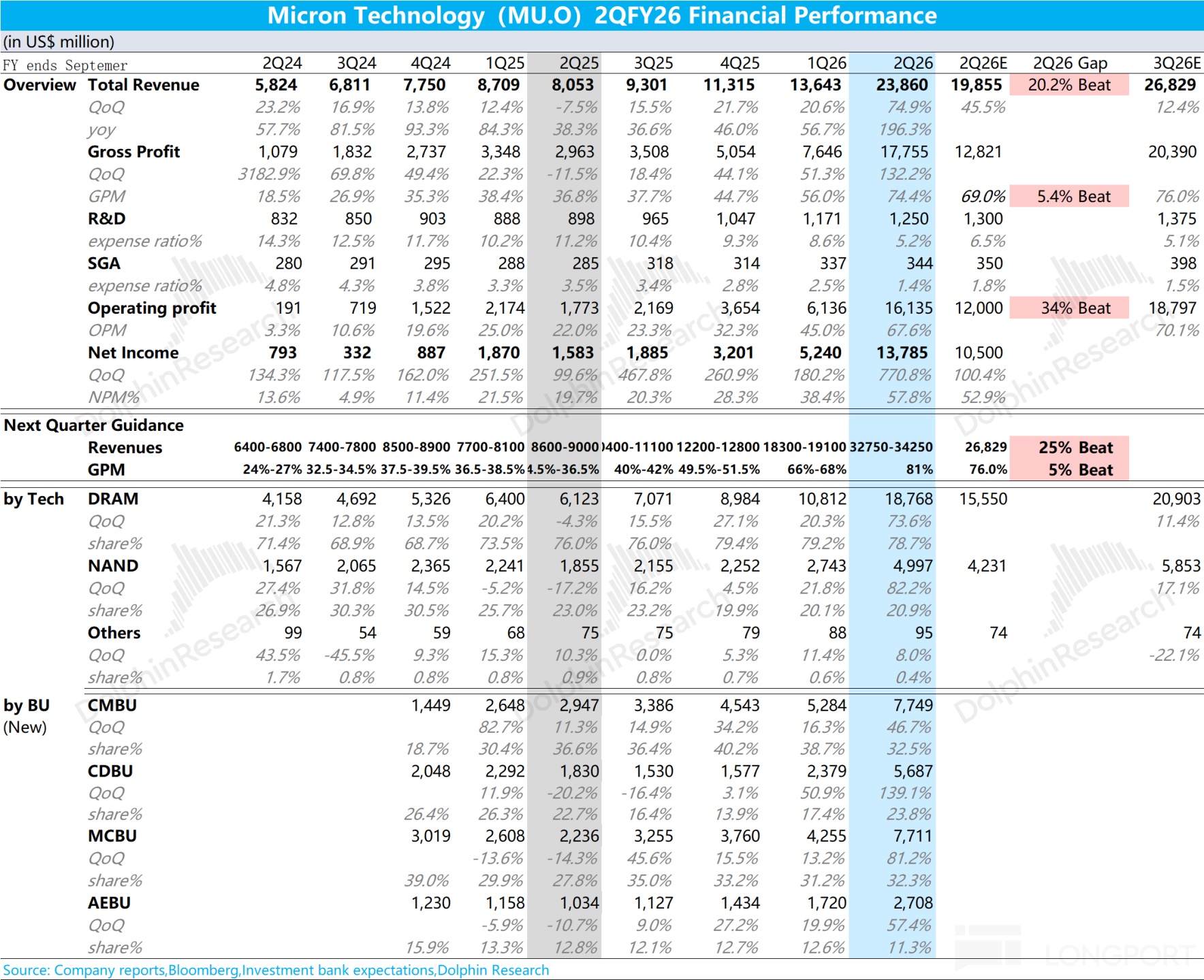 1.整体业绩:美光本季度营收 238.6 亿美元,环比增长 75%,好于上调后的买方预期(199 亿美元),本季度收入增长主要来自于 DRAM 和 NAND 业务的双重带动,两大业务环增都在 70% 以上。