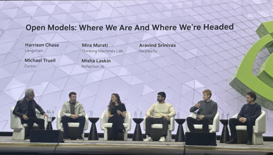 黄仁勋穿着印着Cursor logo的皮夹克走上台,没有PPT,只是把Cursor CEO Michael Truell、Perplexity CEO Aravind Srinivas、LangChain CEO Harrison Chase、Reflection AI CEO Misha Laskin、Thinking Machines Lab CEO Mira Murati请到台上,开口就定下了聊天的基调:“咱们就像在我家客厅一样,不用客气,想说话就直接说。”这种去中心化的交流方式,恰与“开放”的主题不谋而合。