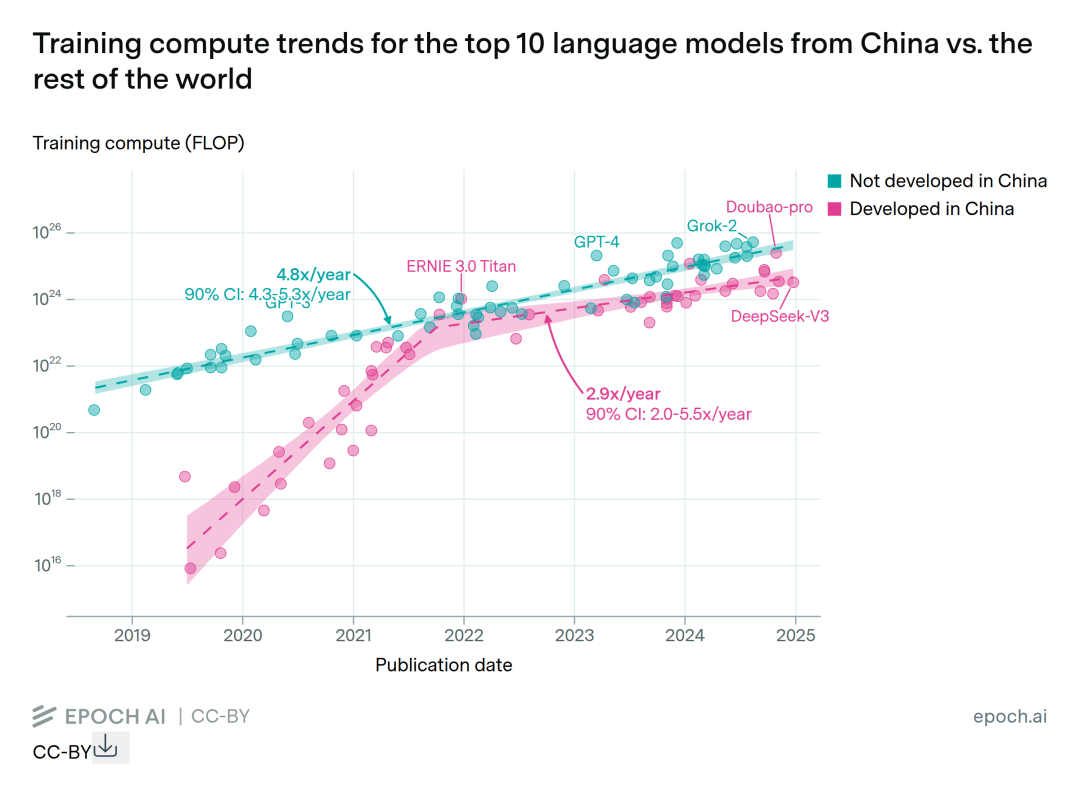 据Epoch AI另一份报告显示,2019年后中国顶级中文语言模型训练计算能力迅速增长,2021年底曾追平全球,但此后放缓,这导致自2021年底以来,前十中文模型每年训练计算能力增长约3倍,远低于全球其他地区自2018年起每年5倍的增速。而按照当前发展速度,中国需约数年才能达到全球顶级模型的计算水平。
