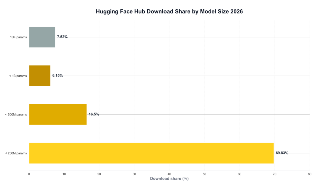 Hugging Face Hub的模型下载量统计同样印证了这一趋势:92.48%的下载量来自少于10亿参数的模型,86.33% 为5亿以下,69.83% 为2亿以下。