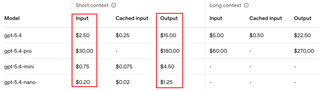 而输出价格上,GPT-5.4是15美元/百万 token,mini版约为它的1/3(4.5 美元),nano版约为它的1/12(1.25 美元)。