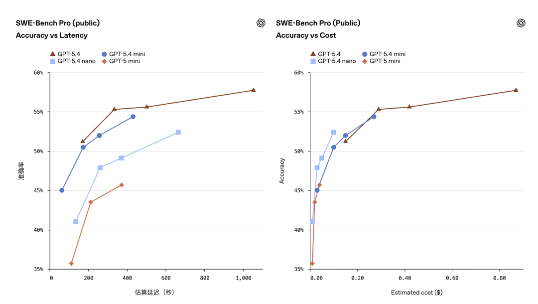 GPT-5.4虽然准确率稳居第一,但是在横轴上却延伸了太远,也就是不仅思考久,烧的钱还多。而nano和mini的折线则整体居于坐标图左侧,标志了它们极高的性价比。