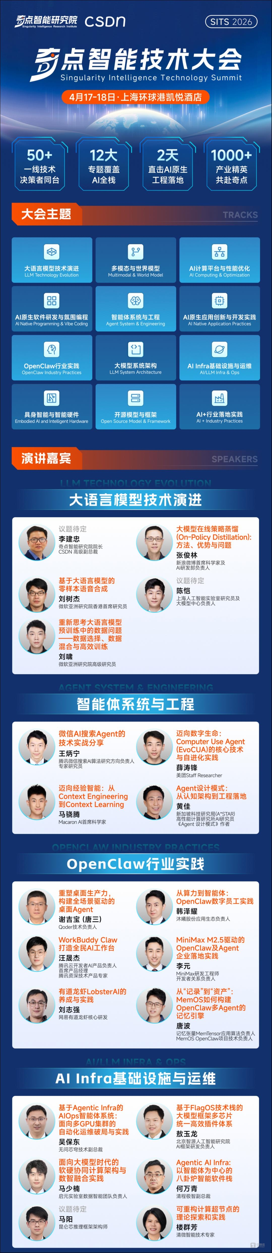 这正是 「2026 奇点智能技术大会」 希望回答的问题。由 CSDN 与奇点智能研究院联合举办的 2026 奇点智能技术大会(原全球机器学习技术大会)将于 4 月 17-18 日在上海·环球港凯悦酒店正式召开。