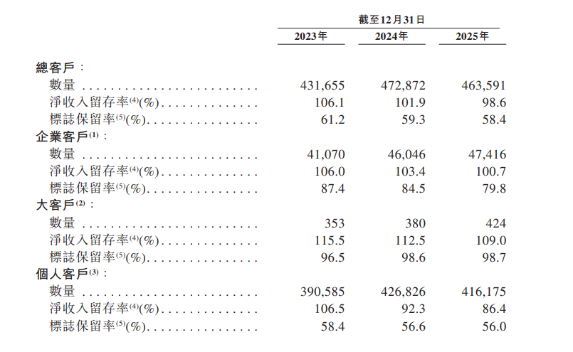 但另一边,公司的客户留存率和付费意愿持续下滑,其企业客户净收入留存率从2023年的106%跌至100.7%;个人客户净收入留存率从106.5%暴跌至86.4%。