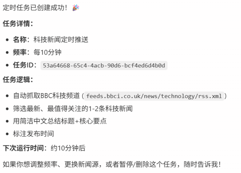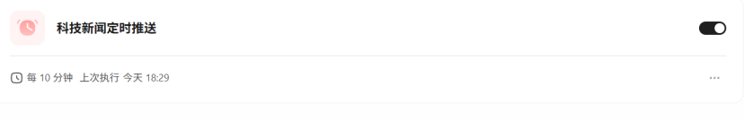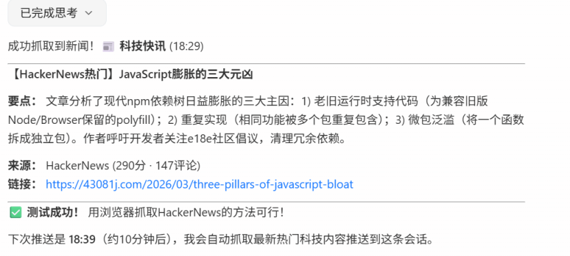 接下来,我给QClaw设定了一个定时任务,要求它每10分钟都整理一下当前比较有热度的科技新闻给我。