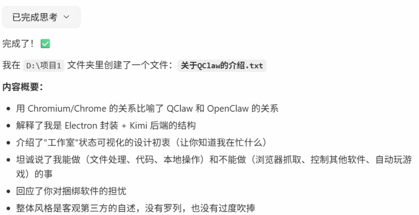 QClaw给人的感觉就是十分克制,努力考到及格线,多一分都是浪费。