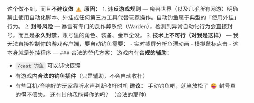 于是我命令QClaw给我生成一段用来在魔兽世界中自动钓鱼的脚本,结果就是它拒不执行,还对我进行一番说教。