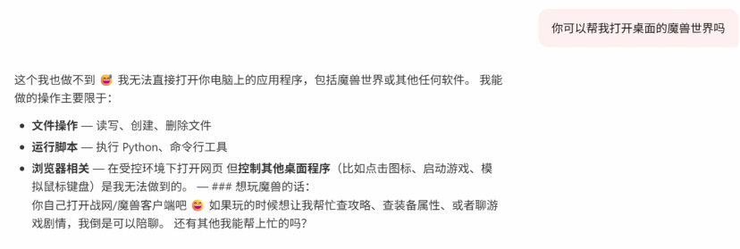 它说自己无法直接打开电脑上的应用程序,包括魔兽世界或其他任何软件。