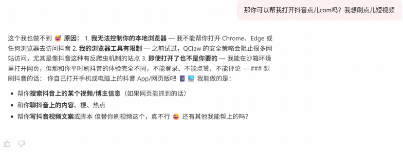 它的浏览器工具有限制,QClaw的安全策略会阻止很多网站访问,尤其是像抖音这种有反爬虫机制的站点。