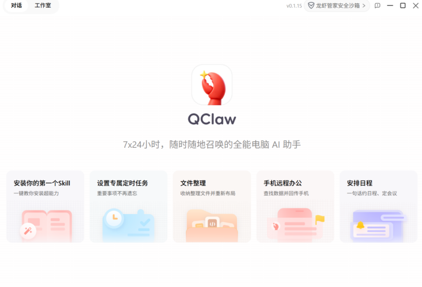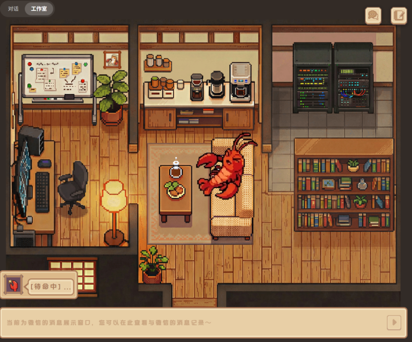 最明显的是多了一个工作室界面。这个界面是用像素风格的动画,表示你的QClaw正在执行什么任务。我的小龙虾在沙发上休息,代表什么任务也没有执行。