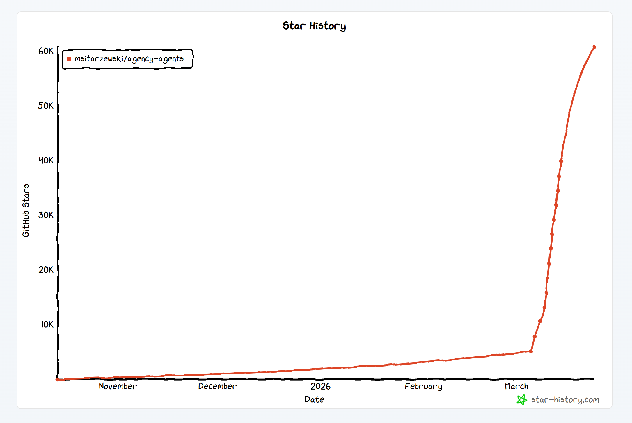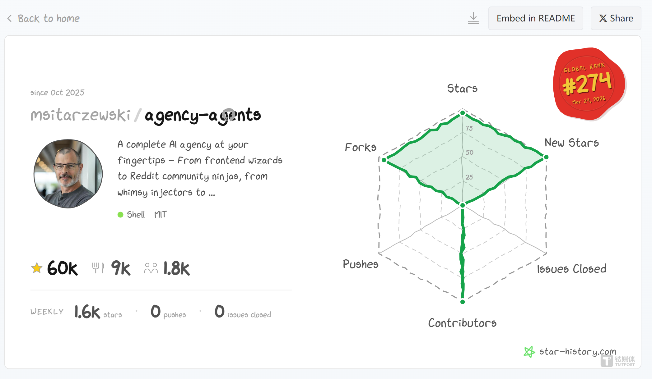 截至 2026 年 3 月 24 日,由开发者 Marek Sitarzewski 发起的项目 agency-agents,星标(Star)总数已突破 6万枚。在过去七天内,它净增了超过 2.3 万个星标,直接挤掉了一众砸下重金做宣发的大厂开源项目,登顶全球 GitHub 周增长榜首。