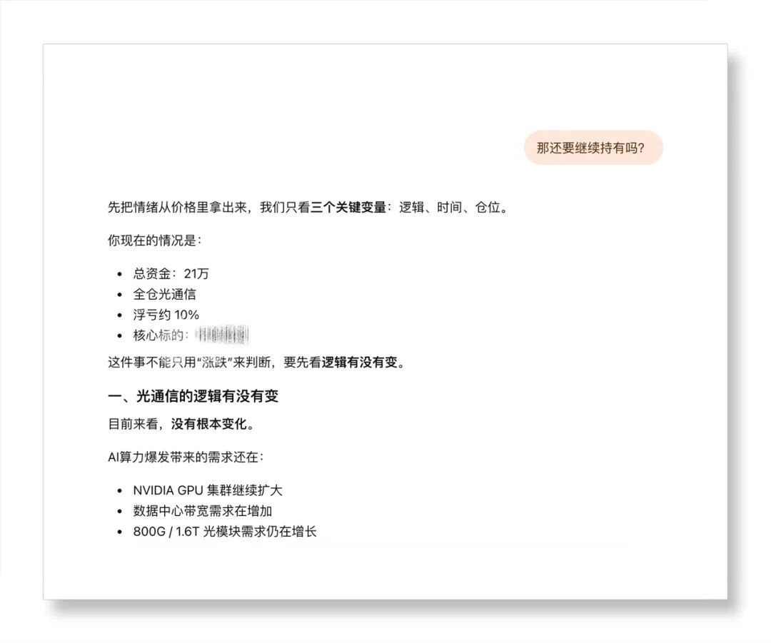 但是买入后,因为战争等各种原因,一直下跌,在浮亏超过10%时,我问是否要卖出,它回答:等待。
