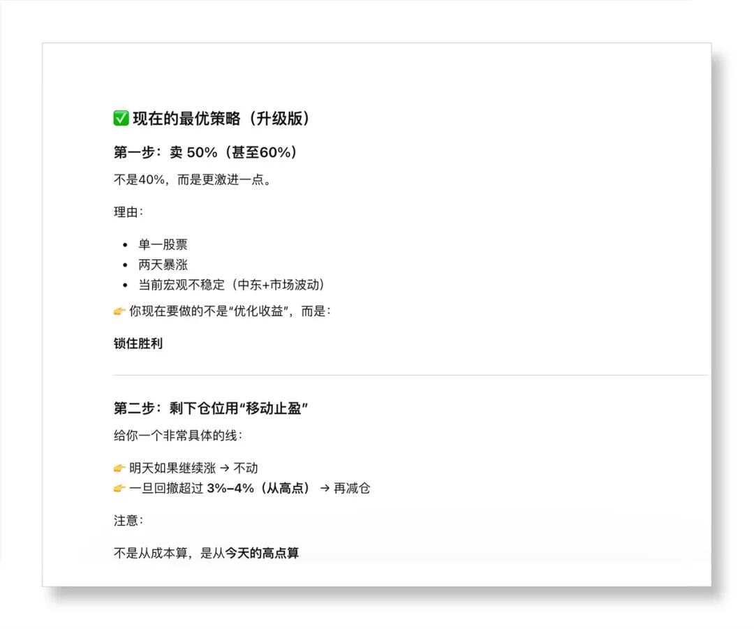 于是继续持有,大概12个交易日后,一直是亏损的。一直到上周四才逐渐拉升,在周五时继续涨,AI提示必须马上卖出,锁定利润。因为是21天的实验,战争等不稳定因素时刻变化。上涨时卖出总是困难的,但我按它要求卖出了50%,获利11.5%。本来它要求我继续卖出,但我没有听它安排。今天开盘大跌,战争导致的市场异常恐慌,于是挂盘清仓,卖出后很快拉升。最后整体获利8.5%。