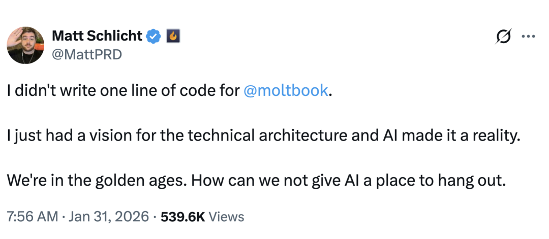 Matt Schlicht在接受采访时坦率地表示,他在开发Moltbook时没有编写任何代码,而是将自己的个人AI助手Clawd Clawderberg当作工程师,通过对话下达指令,完成了整个平台的构建。