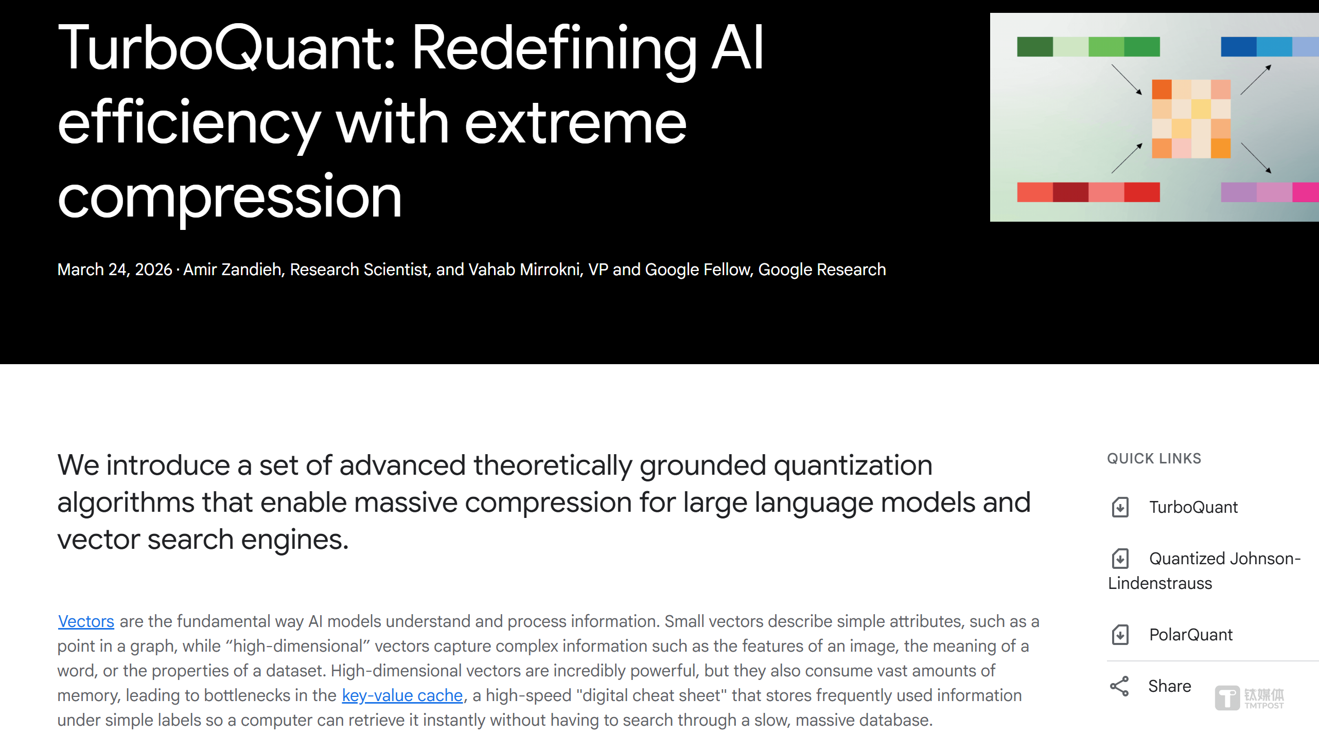 美东时间3月24日,谷歌研究院(Google Research)发布了一项名为TurboQuant的免训练(training-free)AI内存压缩算法。