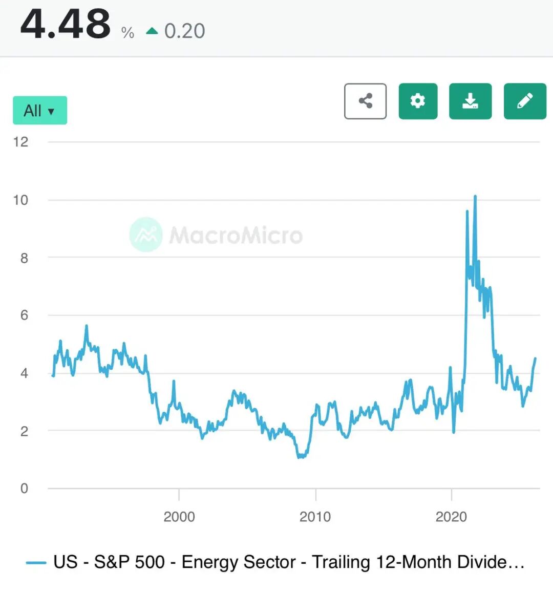美股标普能源板块,过去几年累计分红收益率接近两位数,以ExxonMobil、Chevron等石油巨头为主,2021到2024年板块股息率维持在4%–6%,显著高于标普500整体水平。