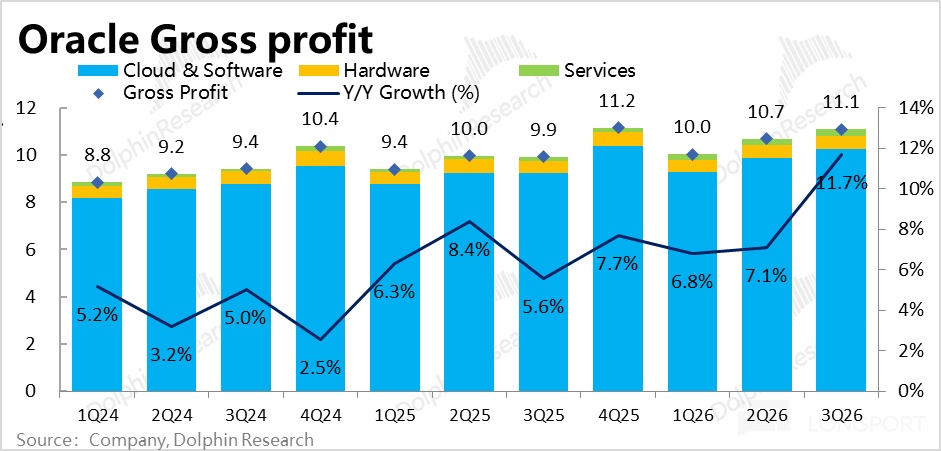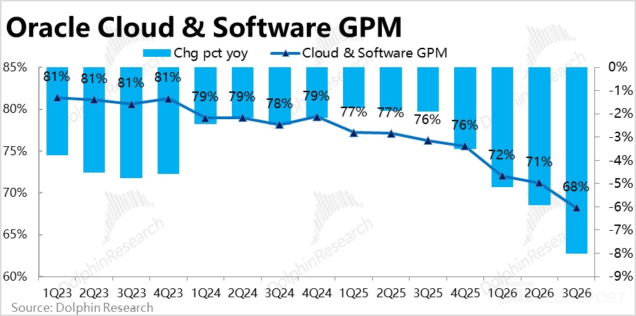 2、AI 业务对毛利率的拖累比预期要严重:作为 OCI 加速增长的伴生影响,本季云 + 软件业务合计的毛利率(不单独拆分披露),本季约 68%,同比跌幅达到 8pct,比上季的 5.9pct 进一步扩大,差于市场预期。