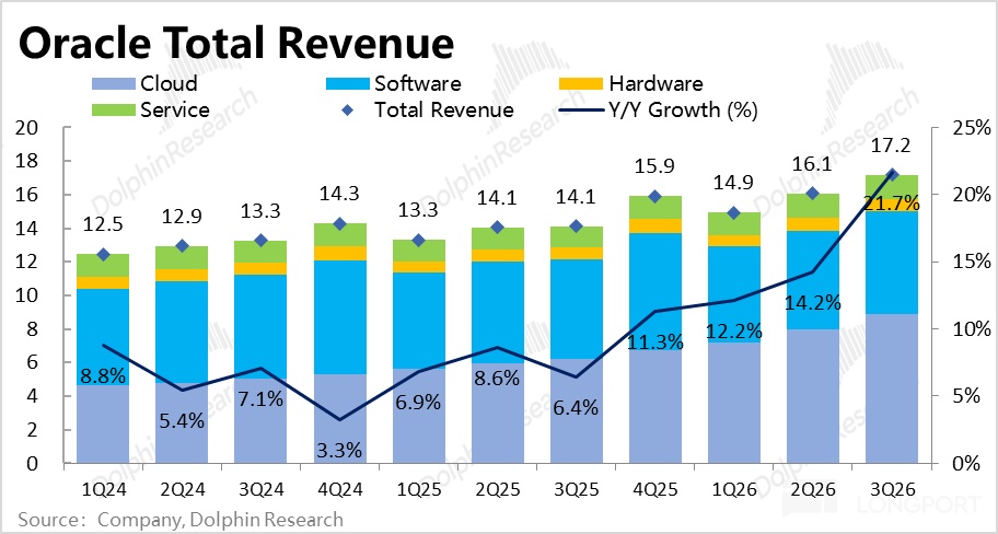 作为一个上世纪 80 年代就已成立的软件业 “老兵”,甲骨文历史上的核心业务主要是数据库和软件服务(传统许可证模式)。但近年来,随着公司的云转型努力以及 AI 的爆发,云服务已后来居上,成为最重要&最受关注的板块。