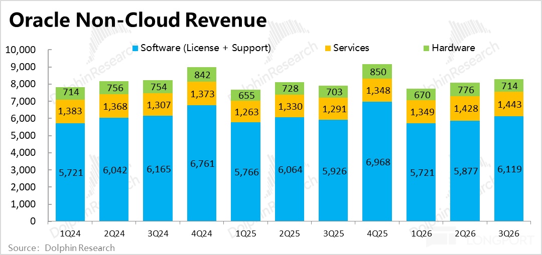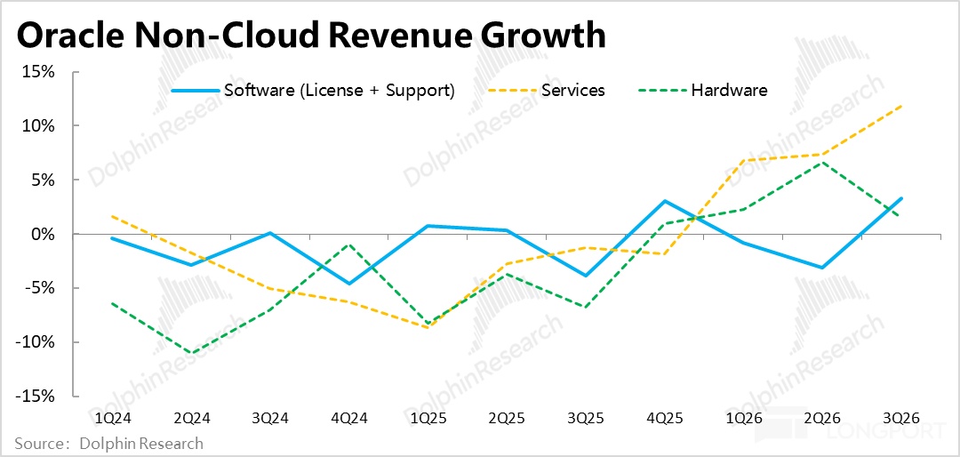 首先大背景是,甲骨文剔除 OCI 业务 -- 即 IaaS 云业务外,剩下的所有传统业务都已完全没有成长性,长期营收增速都只徘徊在零上下、好也不过个位数增长。且在当下,和其他软件公司一样,这部分传统业务也存在被 AI 颠覆的风险。