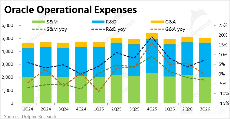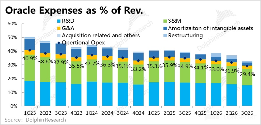 但伴随着 OCI 的体量加速增长,其对毛利率的拖累也越发明显。本季云 + 软件业务合计的毛利率(公司不单独拆分披露),本季约 68%,同比跌幅达到 8pct,比上季的 5.9pct 进一步扩大,且比市场预期的也更差。