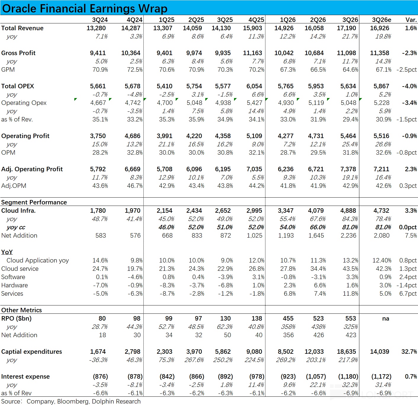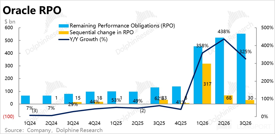 因此,OCI 业务可以说是公司的唯一值得关注的板块。重点关注OCI 营收的增长加速情况、以及反映新增需求的未履约合同 RPO 增长。虽然单季营收表现并不足以证明/证伪公司长期业绩指引到底能不能落地,但至少能反映了短期内公司的执行力和产能落地是否顺利。