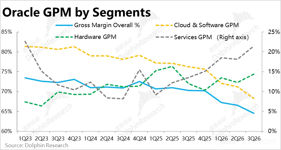 假设软件业务毛利率不变,则云业务整体毛利率可能已跌至 50% 以下,其中 OCI 业务的毛利率则可能仅 30% 上下。