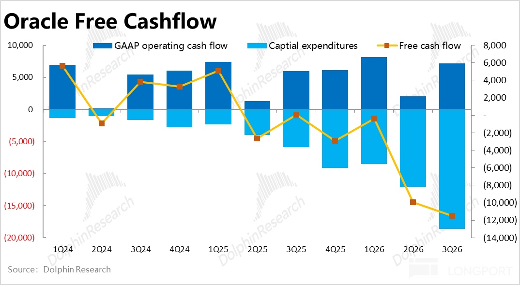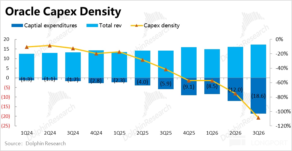 并且本季的 Capex 总额也首次高过了公司本季的总营收额,虽然另一新云 CoreWeave 的情况类似。但毕竟 Oralce 是个有另一半收入来自传统业务的老龙头公司,还是非常罕见的现象。